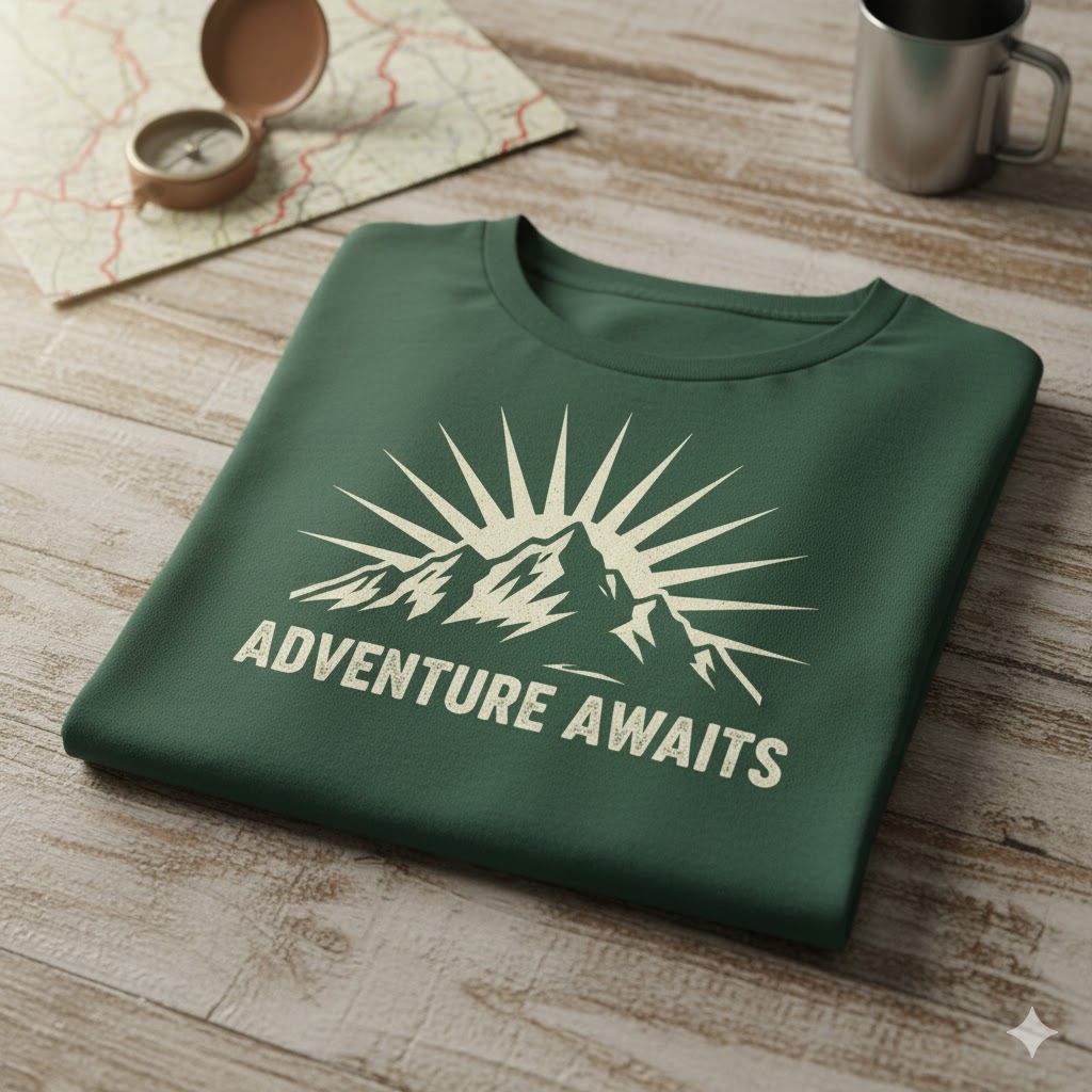 A graphic featuring a silhouette of majestic mountains, a rising sun, and the text “Adventure Awaits” in a bold, adventurous font.