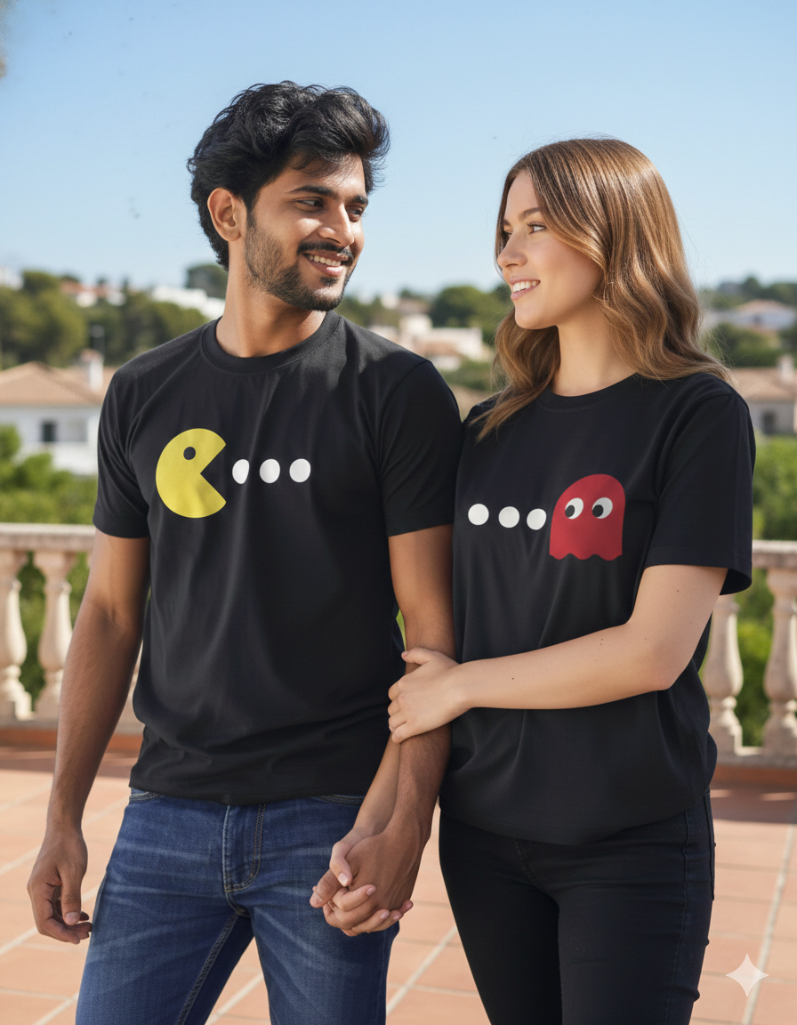This playful couple t-shirt set features a clever gaming-inspired design — Pac-Man on one tee and the heart-stealing ghost on the other. Perfect for couples who share a sense of humor, nostalgia, and fun, these matching black t-shirts turn a classic arcade icon into a modern love story.