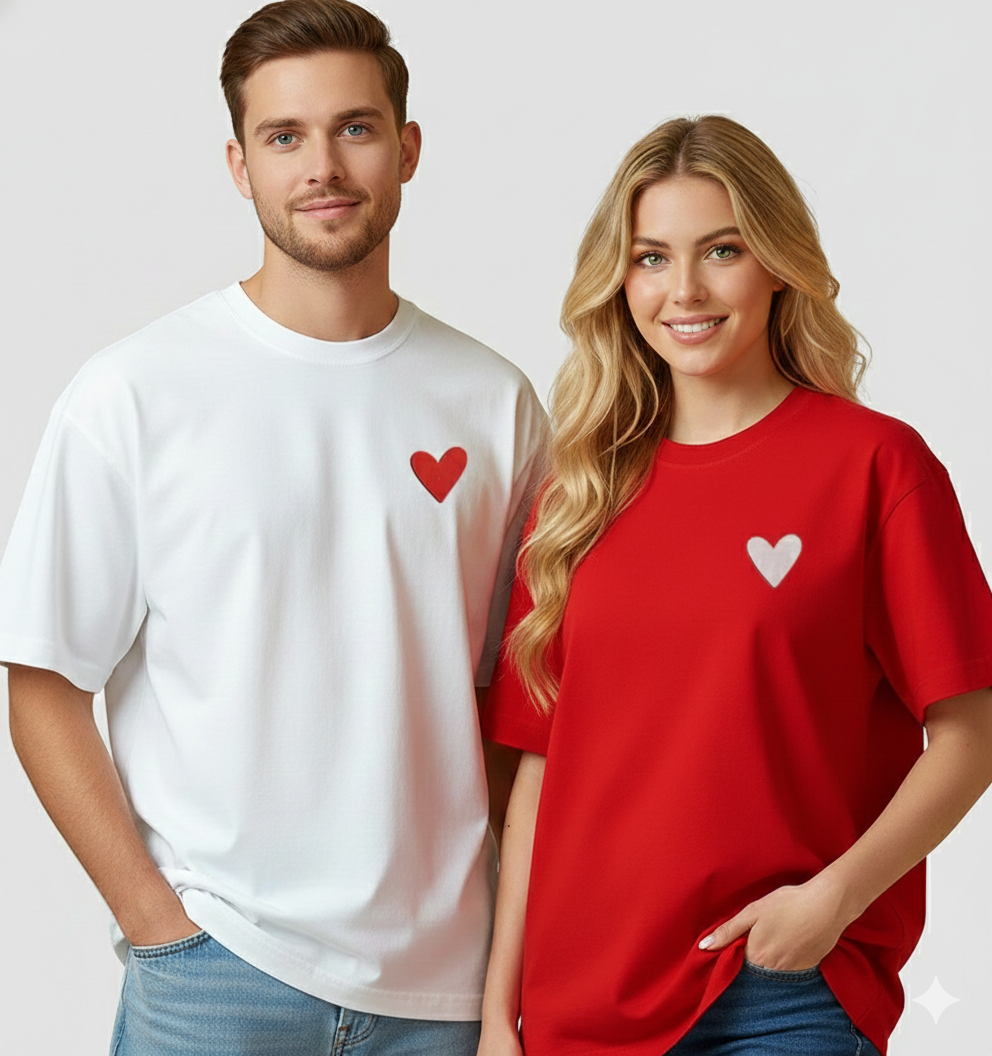 Elegant, minimalist matching tees with a classic heart emblem for couples who let their chemistry do the talking.